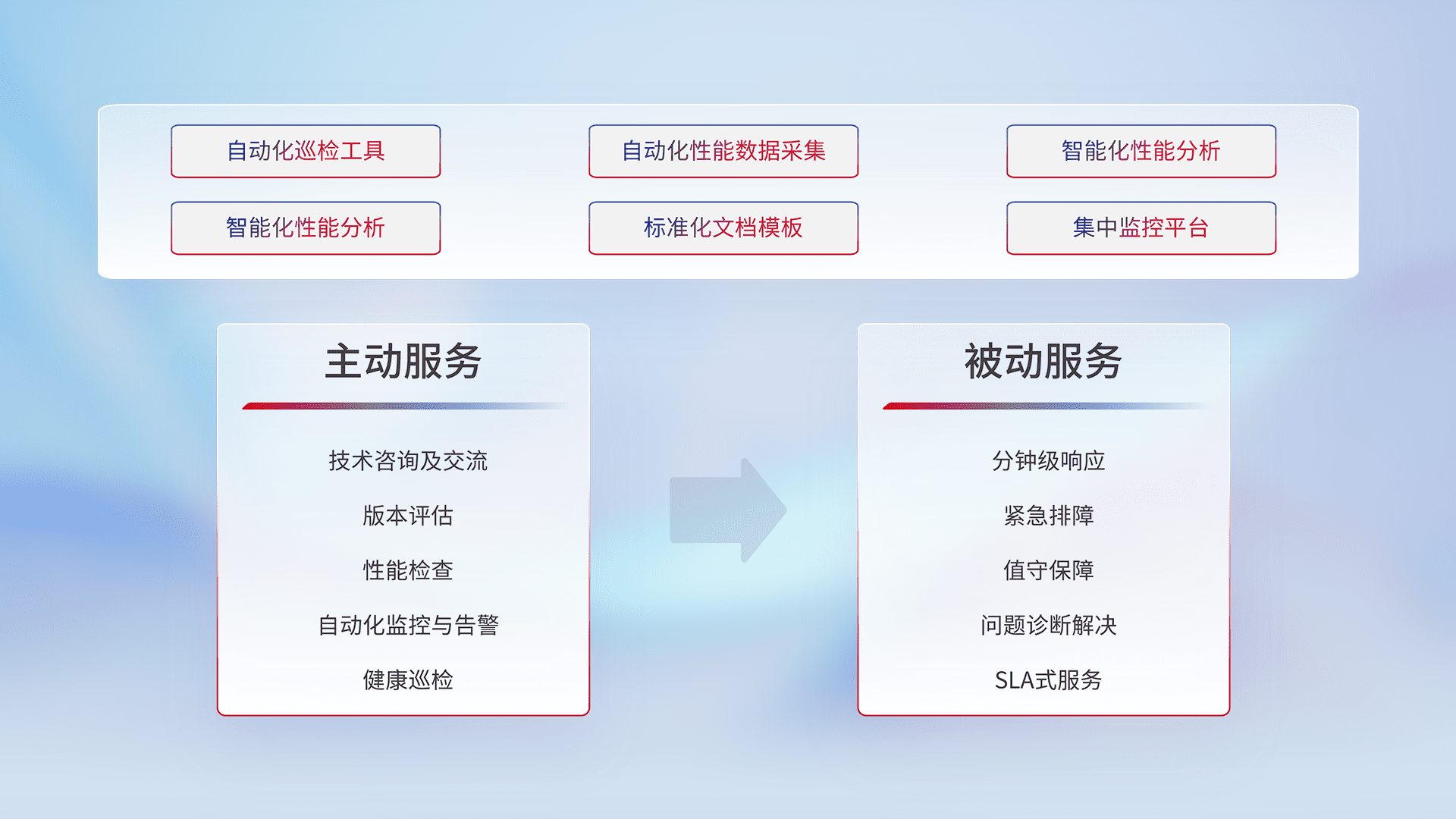 智能化工具和标准化文档,,,保障服务质量,,提供主动服务(包含技术咨询、、、版本评估、、、、性能检查、、、、自动化监控与告警、、、、健康巡检)和被动服务包含(分钟级响应、、、紧急排障、、、、值守保障、、问题诊断解决、、、、SLA服务)。。